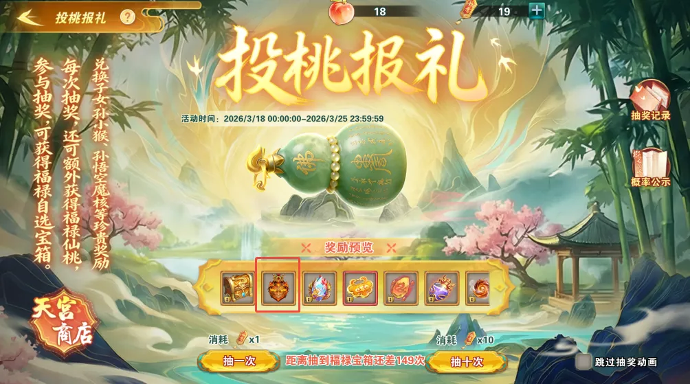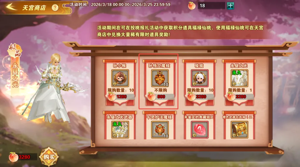 在活动期间会开启限定商店【天宫商店】,少侠们可以使用福禄桃在天宫商店中兑换孙悟空魔核,通过孙悟空魔核去合成孙悟空将魂。