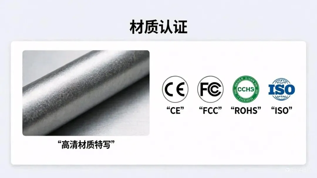 - 核心呈现:高清特写图(材质纹理、原料颗粒、工艺细节)+ 权威认证标识(CE、FCC、ROHS、ISO等,无认证需补充第三方材质检测报告)