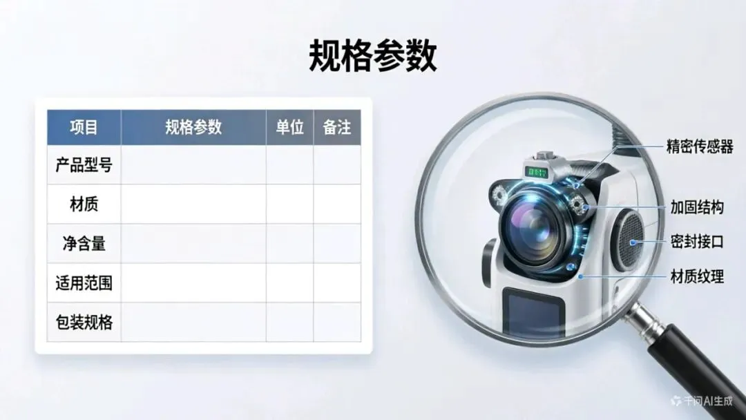 - 核心呈现:参数对比表(尺寸、重量、容量、承重、适用电压等核心参数)+ 高清标注图(用箭头标注产品关键部位,标注英文名称)