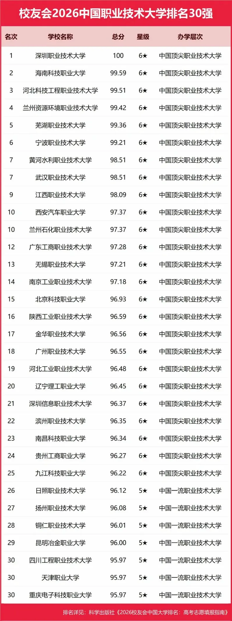 2026年校友会中国职业技术大学排名。本排行榜是针对我国所有的职业技术大学的排名。在本次排名中广东地区大学均表现不错。深圳职业技术大学居全国第一。广东工商职业技术大学第十二名。广州职业技术大学排第十八名。三所高校排名结果体现出广东职业技术教育的整体水平。