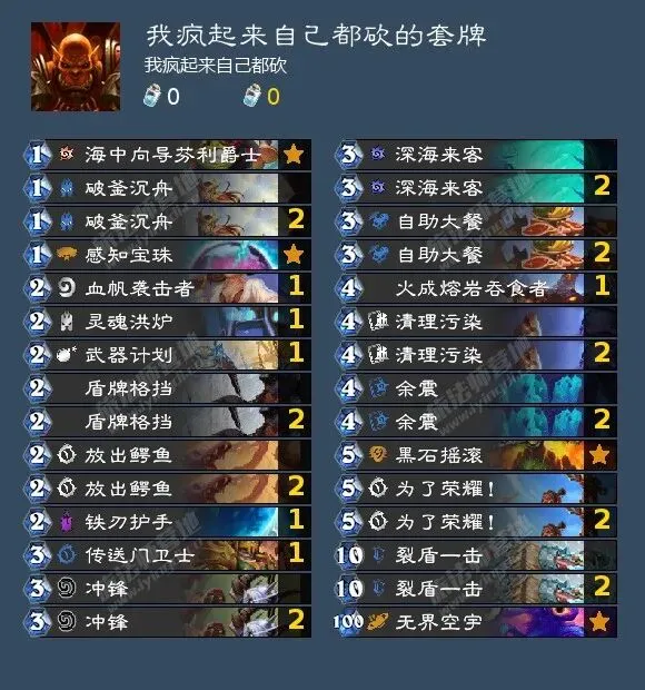 言归正传,既然超杀战降温了,那其他战士套牌有没出路呢?有的!兄弟们。虽然说35.0补丁削了鳄鱼,但是空宇加强了:由125费回调到100费。有的小伙伴会说这不是削弱了吗?叠百甲都少了25点,哪里来的加强之说?嘿嘿!这就是引出了我们今天推荐的套牌主角了--【黑石百甲冲锋战】