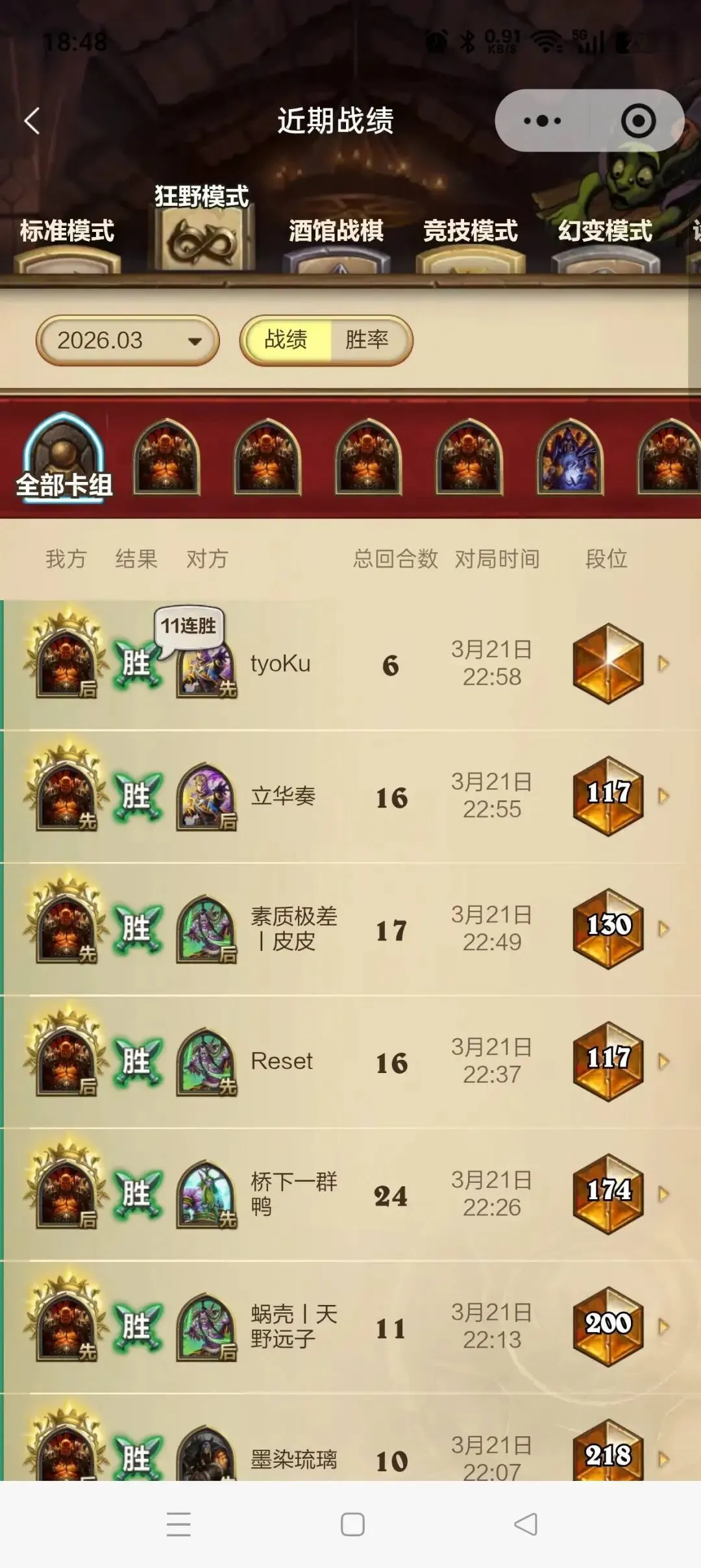 随着大地裂变版本上线后,环境马速更快了,除了旧版的光速牧大人,现在又多了新卡补强的任务奇数猎,野兽猎,献祭过牌任务瞎,裂变树人德,新版弃牌术..... 为了应对以上各种神仙牛马卡组,我这里也是对以前旧的百甲冲锋套路,进行变态构筑,重新调整构筑后,让卡组的马速极大提升,整体战绩如下,胜率和战绩还不错,证明非常适合当前环境。