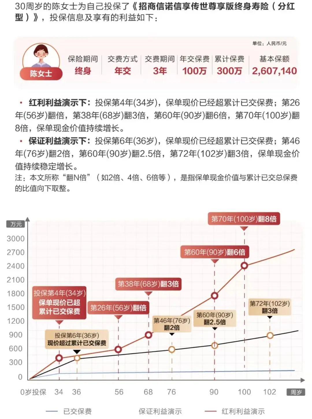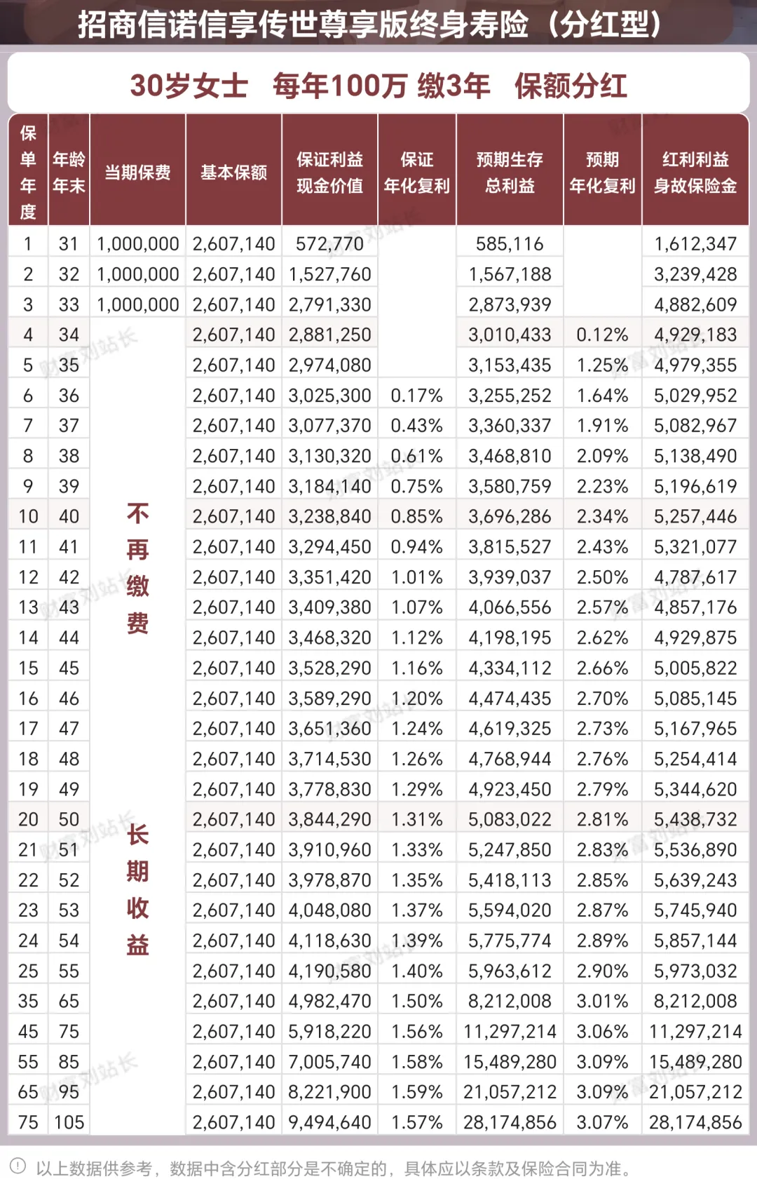 2. 长期增值,潜力可观 📈 我们以“30岁女性,年交100万,交3年”为例,看看它的长期表现(基于演示红利,非保证):