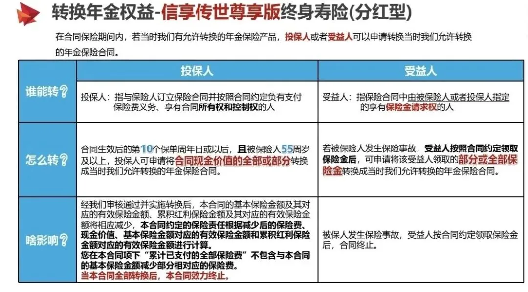 - 年金转换权:在保单生效满10年且被保人年满55周岁后,可以将保单的现金价值全部或部分转换为养老年金,打造与生命等长的现金流,完美解决长寿风险。