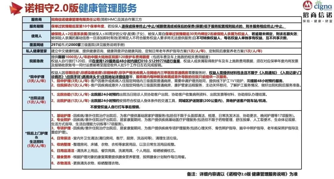 这是信享传世尊享版区别于其他产品的“王牌”,尤其是通过经代渠道投保,可以享受到比其他渠道更全面的“诺相守2.0”健康管理服务。