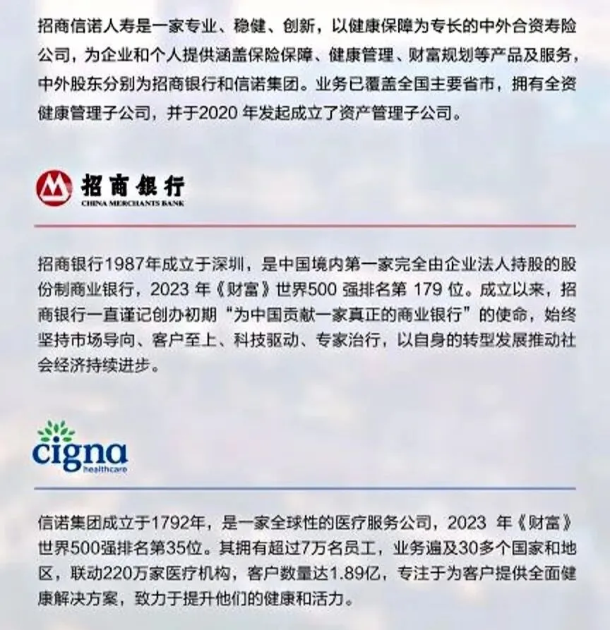 - 外方股东:美国信诺集团(Cigna)。拥有超过230年历史的全球性医疗服务巨头,2024年全球财富500强排名高居第33位。信诺集团的核心优势在于其遍布全球的医疗网络和顶尖的健康管理经验,业务覆盖30多个国家,与超过220万家医疗机构合作。这正是招商信诺在“保险+健康服务”领域拥有独特优势的根源。
