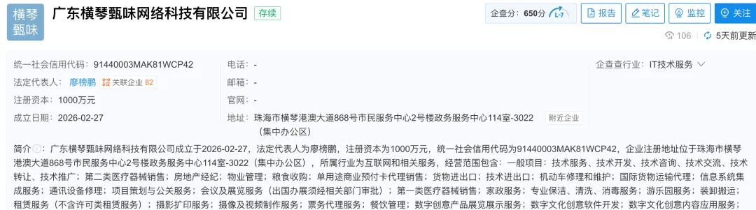 - 2月27日,广东横琴甄味网络科技有限公司正式成立,注册资本为1000万元,所属行业为互联网和相关服务。