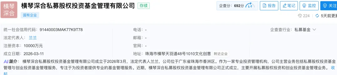 经营范围包含:技术服务、技术开发、技术咨询、技术交流、技术转让、技术推广;第二类医疗器械销售;房地产经纪;物业管理;粮食收购;单用途商业预付卡代理销售等。从股权结构来看,该公司由盒马(中国)有限公司全资控股。- 3月11日,横琴深合私募股权投资基金管理有限公司成立,注册资本1亿元。