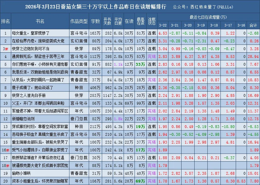 番茄阅读榜范围:30万字以上、已签约未下架、已经开始推荐的番茄原创作品