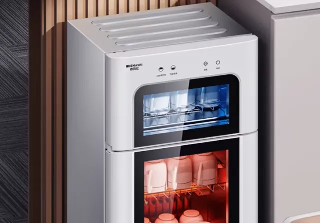 ▶一键启动消毒+烘干,程序固定无需手动调节,老人也能轻松操作,消毒完成后有灯光提示。内胆可拆卸,方便定期深度清洗,减少卫生死角。机身方正简洁可放置在橱柜下方或台面上,适合不想折腾复杂功能、追求实用性的家庭。
