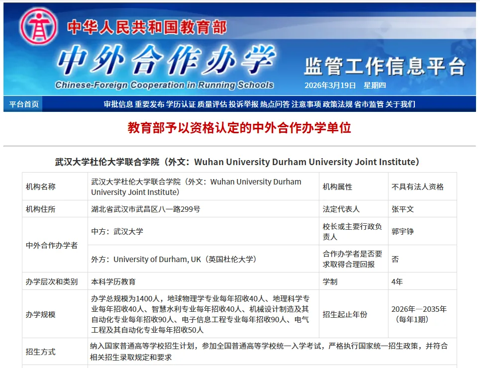 武汉大学杜伦大学联合学院已于2025年12月31日获得教育部批准设立,并于2026年开启首届本科招生。