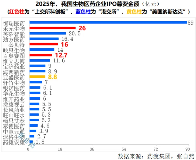 2025年,我国共有24家生物医药企业完成IPO,其中,A股(上交所科创板)上市3家、港股上市20家、美国纳斯达克上市1家。24家上市公司共募集资金292.77亿元,其中,超10亿元的有8家,超20亿元的3家,超80亿元的1家。
