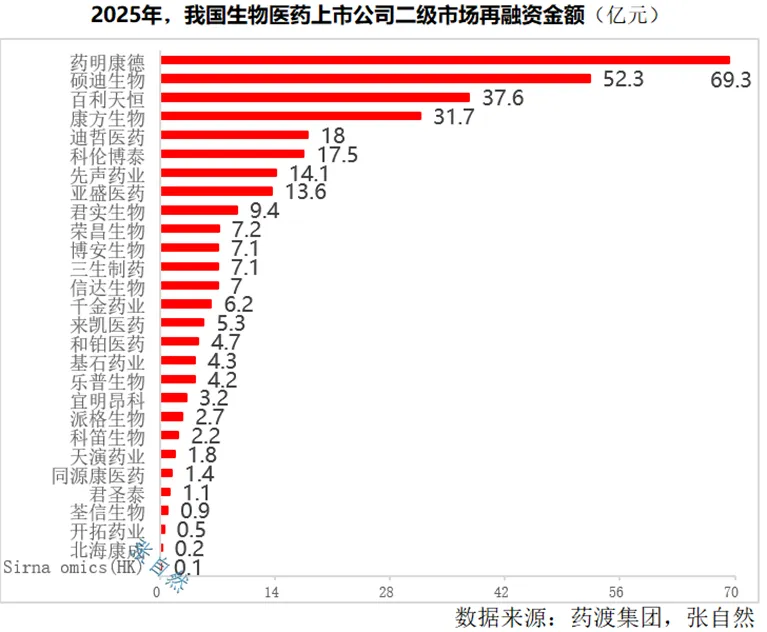 再融资额超过10亿元的还有康方生物(31.68亿元)、迪哲医药(18亿元)、科伦博泰(17.5亿元)、先声药业(14.1亿元)、亚盛医药(13.58亿元)。