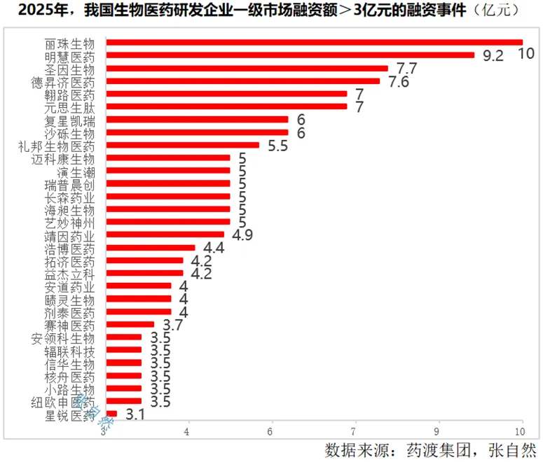 2025年,我国生物医药企业共进行一级市场融资138起,合计融资约260亿元,其中,超3亿元的有30家、超5亿元的15家、10亿元的只有1家。