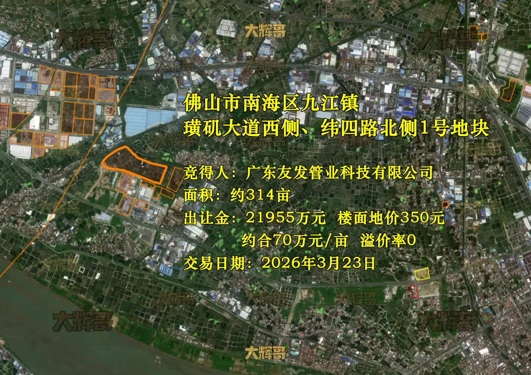 2026年3月23日,一宗位于佛山市南海区九江镇璜矶大道西侧、纬四路北侧1号地块,占地面积约314亩的国有工业用地成功出让。