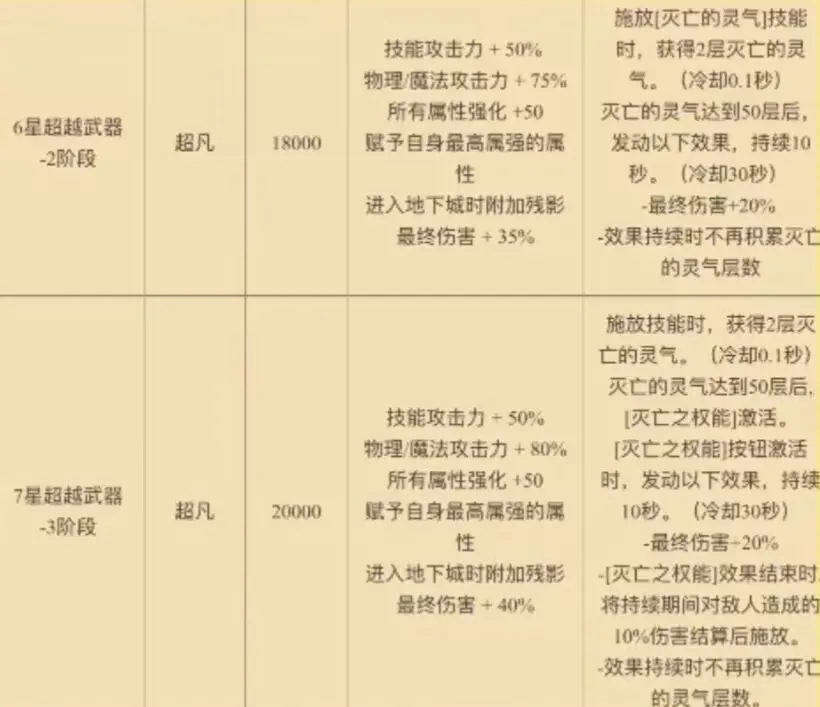 超武作为80版本毕业武器,与史诗武器相比,制作出来就是5星,在拥有常驻30%最终伤害的情况下,专属特效还能再增加20%最终伤害,虽然这一效果有60秒冷却,但根据官方爆料,随着超武升星,常驻的最终伤害将提升至40%,而专属特效的冷却将压缩至30秒。