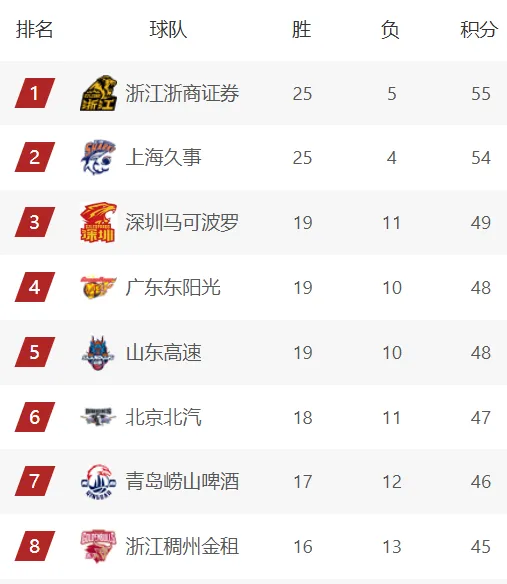 积分榜第5名则是山东队,他们的战绩则是19胜10负,战绩上已经追上了广东队,而北京队则紧随其后,排在积分榜第6名,战绩为18胜11负。对于广东队来讲,深圳、北京以及山东,这三支球队对于他们的威胁最大。考虑到球队接下来还要再战广厦(2次)和北京,一旦球队继续输球的话,还真有可能会在关键时刻阴沟翻船,直接跌出前四名的可能。