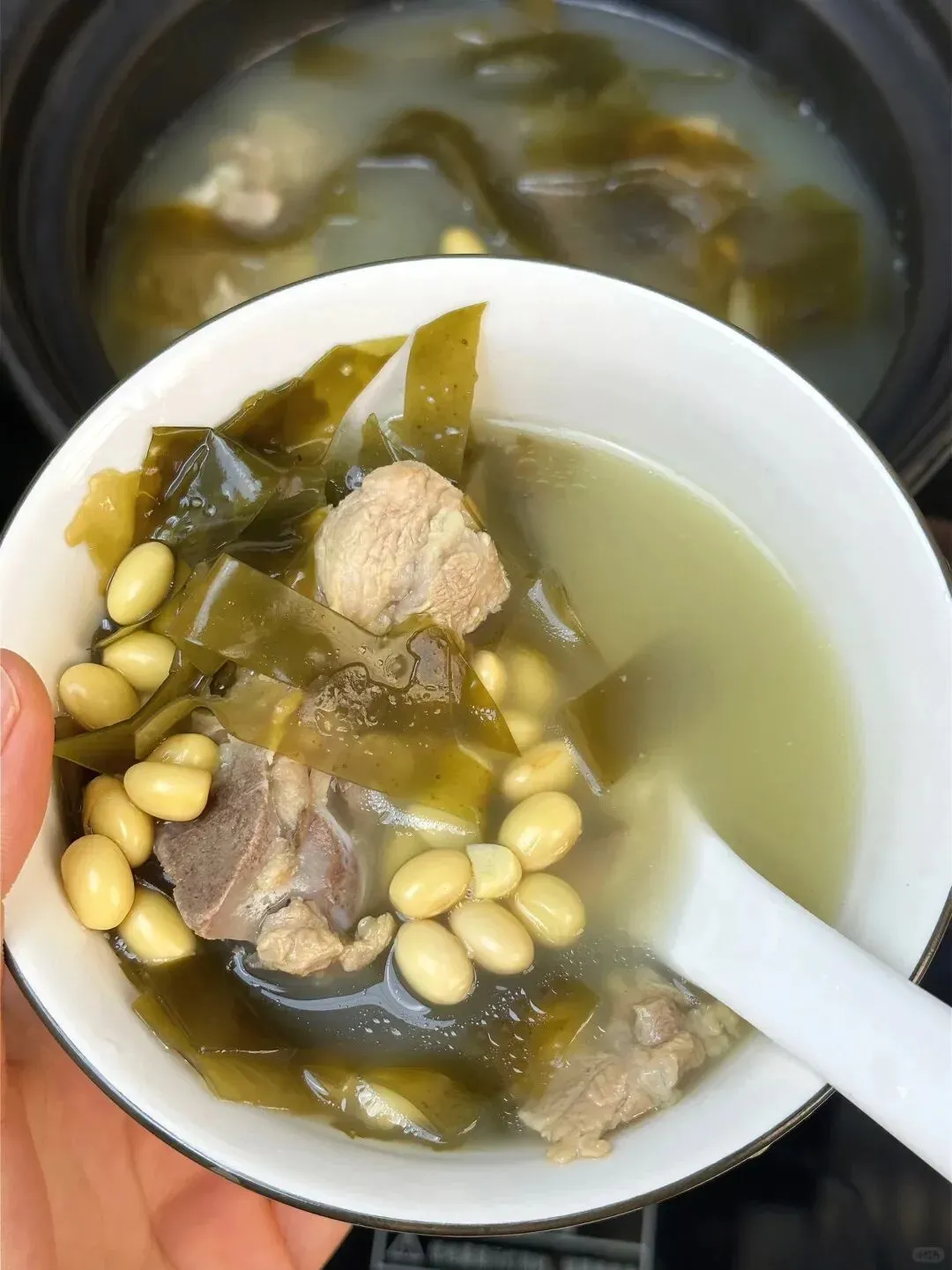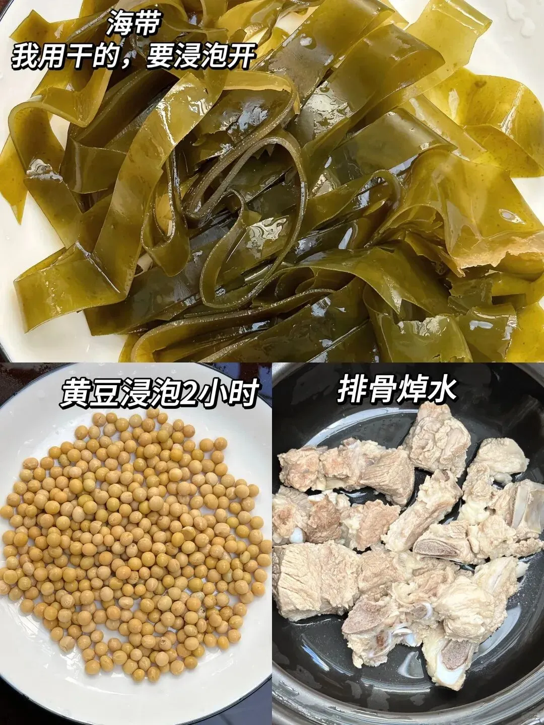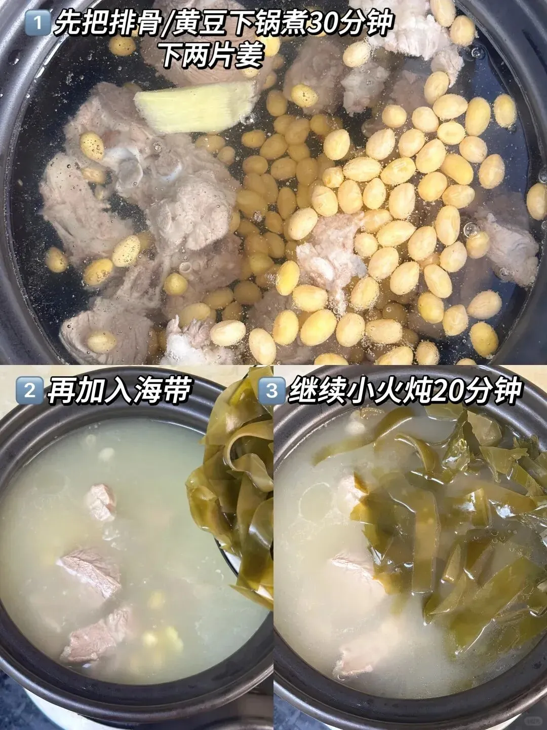 ,先把黄豆跟猪骨加水煮开,转小火炖30分钟后加入海带继续炖20分钟即可,最后加入盐即可开吃,喜欢葱花的可以撒点葱花。好了,今天分享给大家的这4道美食真不错哦,大家记得收藏起来慢慢学!