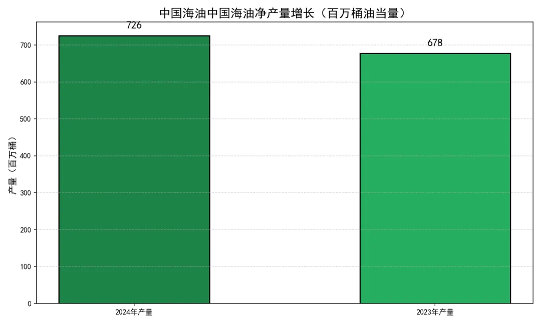 2024年净产量726.8百万桶油当量,同比增长7.2%。储量替代率连续多年保持在100%以上,2023年达到182%。重点油气田包括渤海秦皇岛27-3油田(亿吨级)、蓬莱19-3油田、南海'深海一号'超深水大气田等。