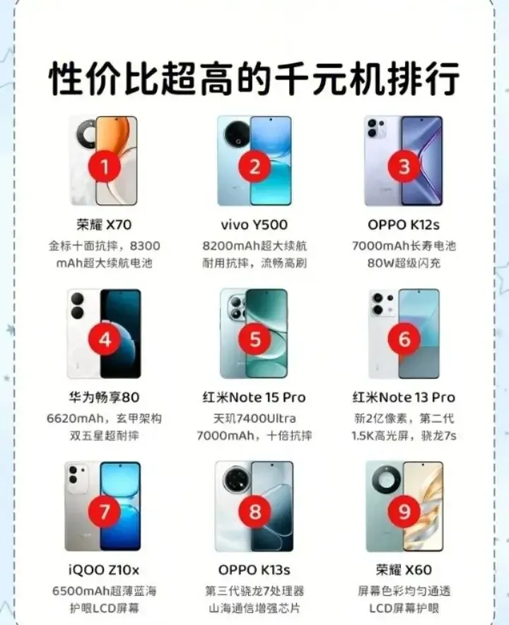 2026年3月9款高性价比千元机排行榜已发:荣耀X70高性价比排名第1