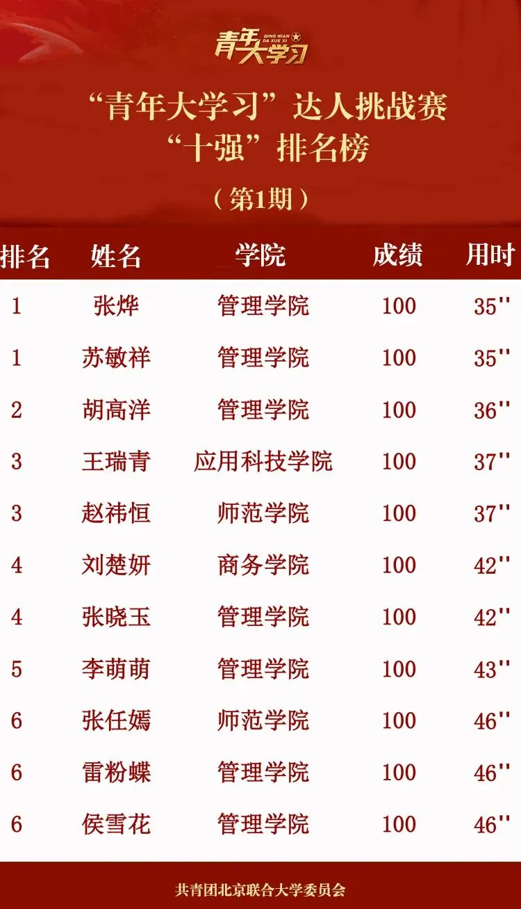 综合同学们的答题得分及用时情况,我们综合评定了前“十强”(含并列),对以上同学我们将送出团委君专属礼品一份。