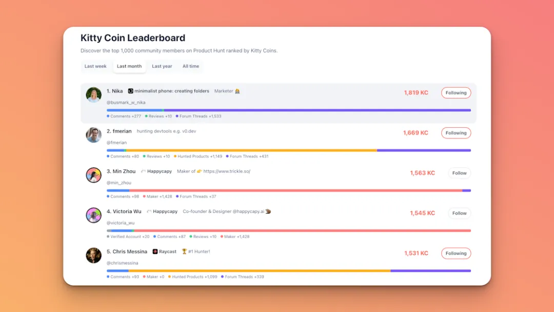 一句话介绍:Kitty Points Leaderboard 通过分周期(周/月/年/总榜)的积分排行榜和透明化的贡献计分规则,让新老用户都能在 Product Hunt 社区中因发布产品、撰写评论、参与讨论等多元行为获得可见的认可与曝光,有效解决长期社区中“新人难出头、非创作者价值被忽视”的参与感失衡问题。