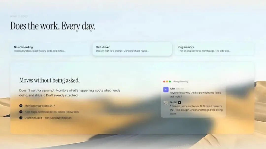 一句话介绍:jared.so 是一个嵌入 Slack 的 AI 员工,能主动“读空气”理解上下文,在合适的时机介入对话、生成报告或执行任务,解决远程团队因信息碎片化和响应滞后导致的协作低效问题,让 AI 不再被动等待指令而是成为有社交感知力的协作者。