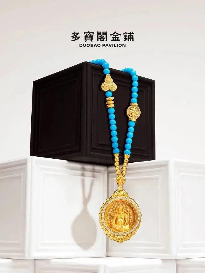 巨幅海报上的是多宝阁的代表产品黄财神嘎乌盒吊坠和多宝灵韵手串。根据多宝阁天猫旗舰店的标价,一个绳款古法手作足金的黄财神嘎乌盒吊坠31.76克售价为85250元,相当于2684元/克。同款吊坠的绿松石链款(足金40.32克)售价高达163230元。