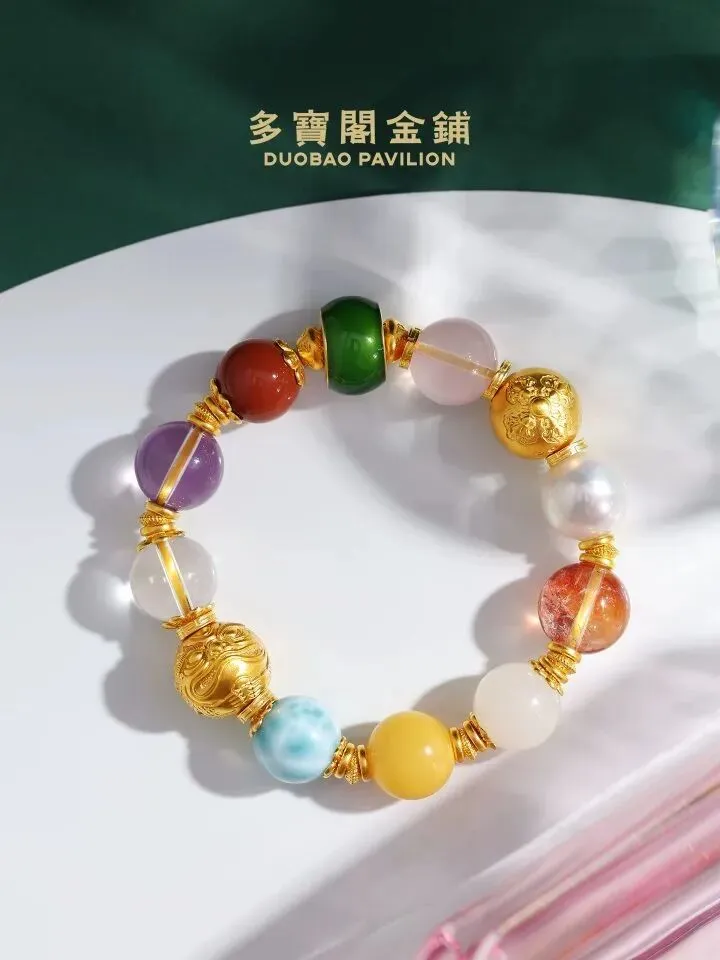 而一件带珍珠、南红蜜蜡、水晶和黄金的灵韵手串(足金重量33.22克)售价为88670元。
