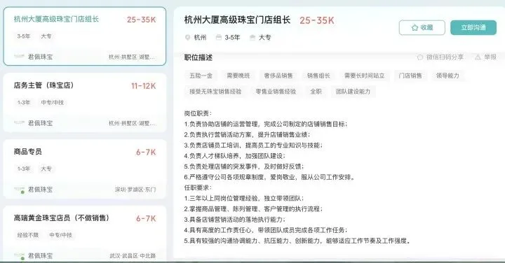 除了即将开业的多宝阁金铺,最近,君佩珠宝在BOSS直聘一口气挂出了杭州大厦高级珠宝店组长、店务主管、商品专员、高端黄金珠宝店员等岗位。其中,门店组长开出的月薪是25k-35k。