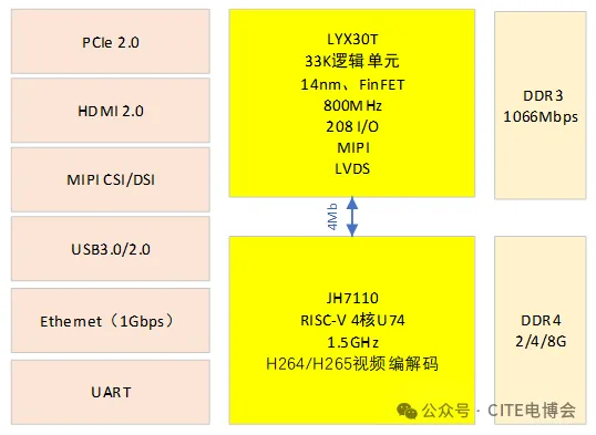 采用龙耀芯FPGA芯片LYX30T配合RISC-V芯片组成低成本异构模组。FPGA + RISC-V异构模组,兼具硬件可编程加速与指令集灵活可扩展,实现算力、功耗、成本最优平衡,高度适配自主可控的定制化场景。