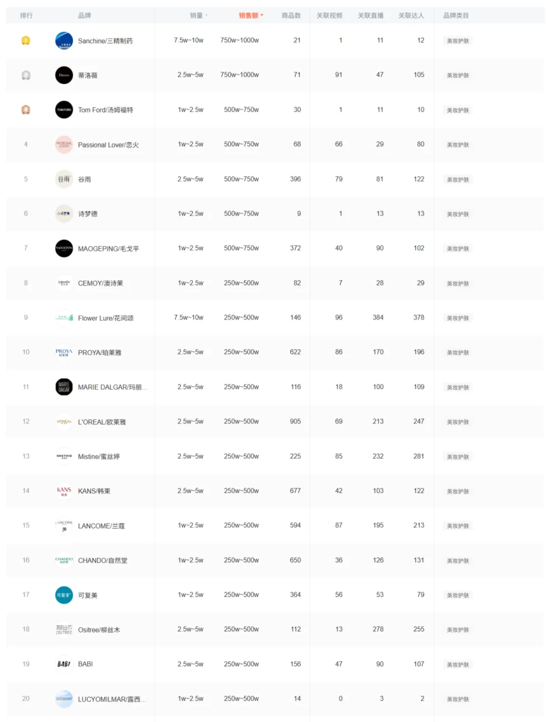 2026年3月24日抖音美妆护肤品牌销售排行榜TOP20