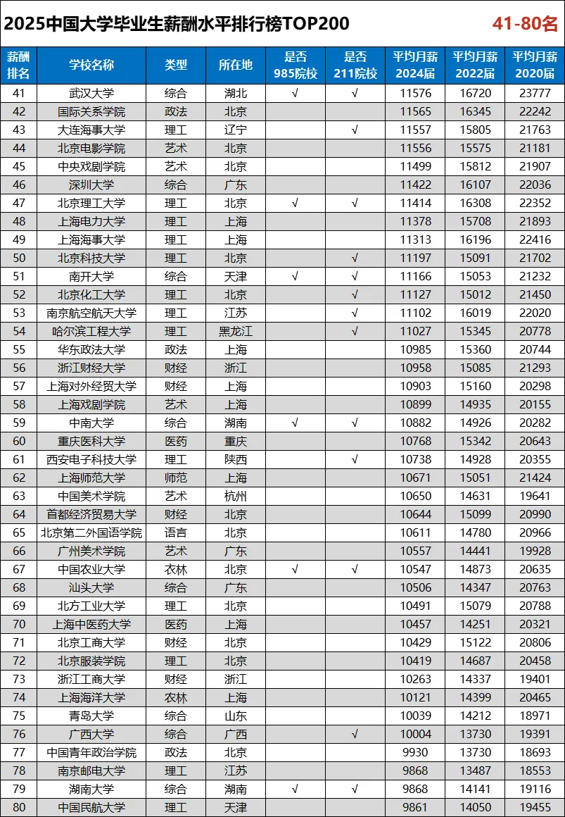 榜单前40名中,985、211及双一流高校占比超90%,前80名中占比也超70%,可见院校的办学层次仍是毕业生就业薪资的重要保障,优质的院校资源能为毕业生提供更好的就业平台和行业资源。