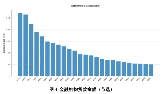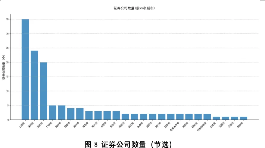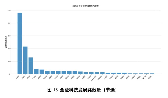 金融科技发展奖数量能够反映城市在金融科技创新成果方面的活跃度和认可度。北京(96个)、上海(43个)、深圳(26个)遥遥领先,形成全国金融科技创新的“塔尖”。但超过四分之三的城市为零,说明金融科技创新的区域分布高度集中在一线城市。