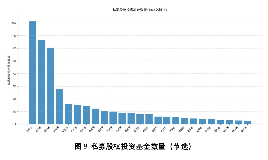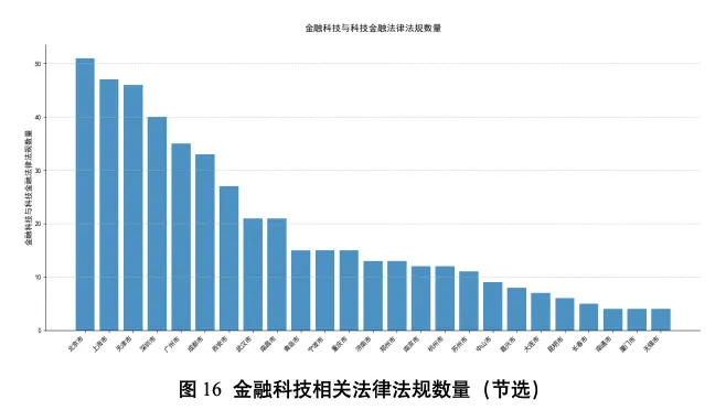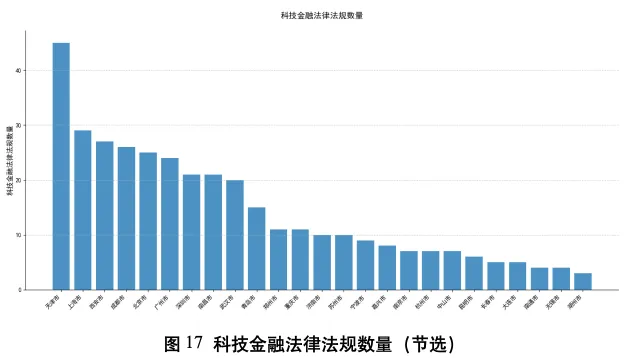 科技金融法律法规数量体现了城市在推动科技与金融深度融合过程中的制度保障和政策引导能力。天津(45)、上海(29)、西安(27)、成都(26)、北京(25)居前,说明这些城市正在积极打造有利于科技与资本结合的法制环境。然而,不少中小城市科技金融法律法规数量仍然为零,制度供给较为不足。