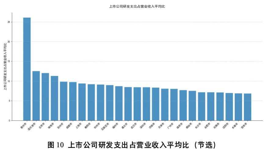 上市公司研发支出占营业收入占比不仅衡量企业的技术密集程度,也揭示其对金融工具与服务的需求强度。泰州、连云港和苏州等城市的研发强度明显高于全国平均水平,其中泰州市以高达26.06%的研发强度居全国首位。这类城市以医药制造、新材料、新一代信息技术等专业方向为主,对科技金融服务具有较强的刚性需求。