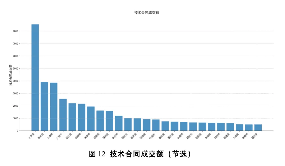 技术合同成交额能够反映一座城市科技成果转化的深度。更为深入的科技成果转化会引致更强的科技金融需求,因而,技术合同成交额成为衡量科技金融需求强弱的重要指标。北京高达8536.94亿元,西安、上海均超3800亿元,形成科技成果交易的核心高地。相对而言,不少中小城市不足20亿元,创新成果市场化水平有限。