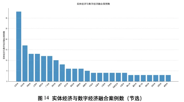 实体经济与数字经济融合案例数反映了城市在推动产业数字化和数字产业化方面的实践成效。全国百强城市平均仅为2.23个,整体水平偏低。超过半数城市仍为零或个位数,说明实数融合尚处探索阶段。北京(33个)、杭州(17个)、上海和济南(各13个)居前,具有一定的引领效应。