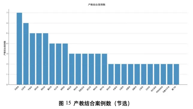 产教结合案例数量能够反映城市在推动产学研深度融合、促进教育与产业协同发展方面的探索深度。从数据来看,天津(7个)、北京(6个)位居前列,显示出较强的产教融合示范效应;深圳、郑州、重庆等城市也表现突出。相比之下,大部分城市案例数不足3个,整体平均水平偏低,说明全国范围内产教结合的实践仍处在初期探索阶段。总体来看,该指标越高,意味着城市在人才培养、科研转化和产业对接方面形成了更紧密的联动机制,从而展现出对科技金融在人才资本与创新资源配置中的作用的更高要求。