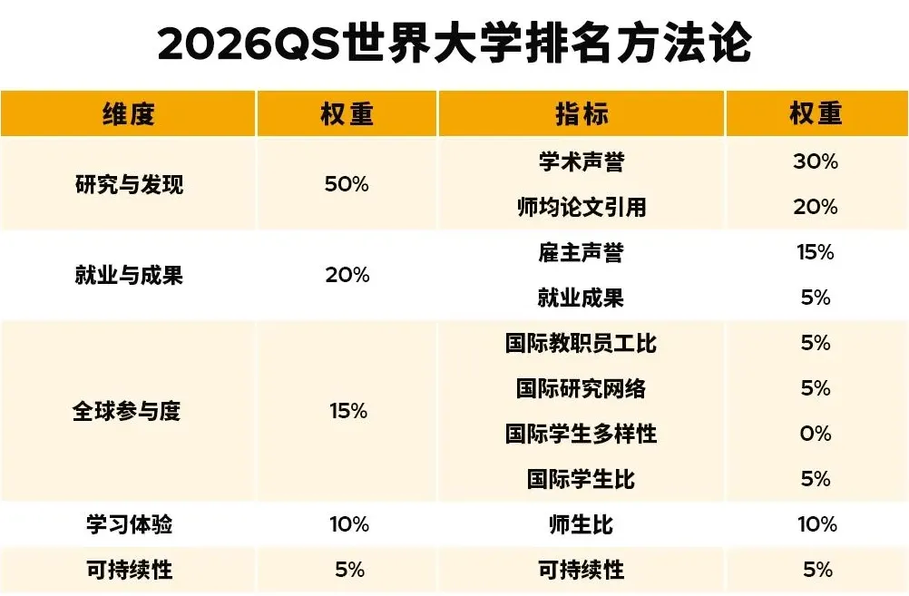QS:就业+声誉双核心—— 学术声誉(40%)+ 雇主声誉(10%)占比超一半,国际化指标(10%)突出,适合关注就业、留学申请认可度的人群;