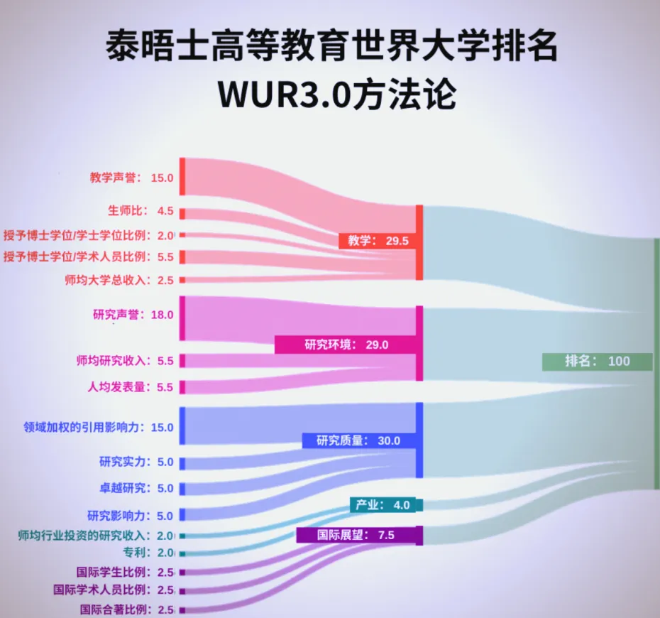 THE:教学 + 科研均衡—— 教学(30%)、研究(30%)、论文引用(30%)三分天下,兼顾综合实力,适合全面评估高校;