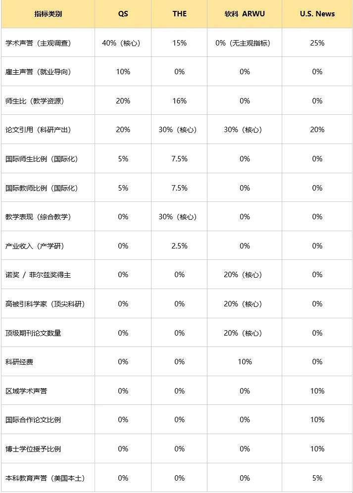 为了直观对比四大国际榜单的核心差异,下面整理了指标权重对比表,清晰标注各榜单的核心侧重方向,方便快速查阅: