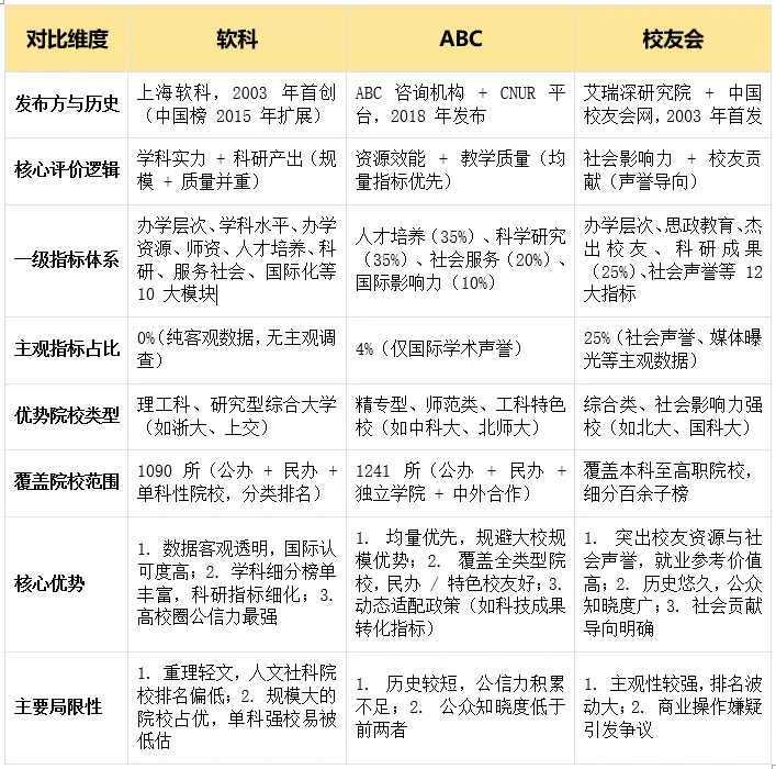 实用导向(高考志愿 / 就业 / 民办院校选择):优先选 ABC 排名—— 覆盖民办、中外合作院校,且 “就业率 / 深造率”“校企合作” 指标权重高,适合分数中等、追求性价比的考生,比如想选民办院校可直接对比 ABC 的民办院校子榜;