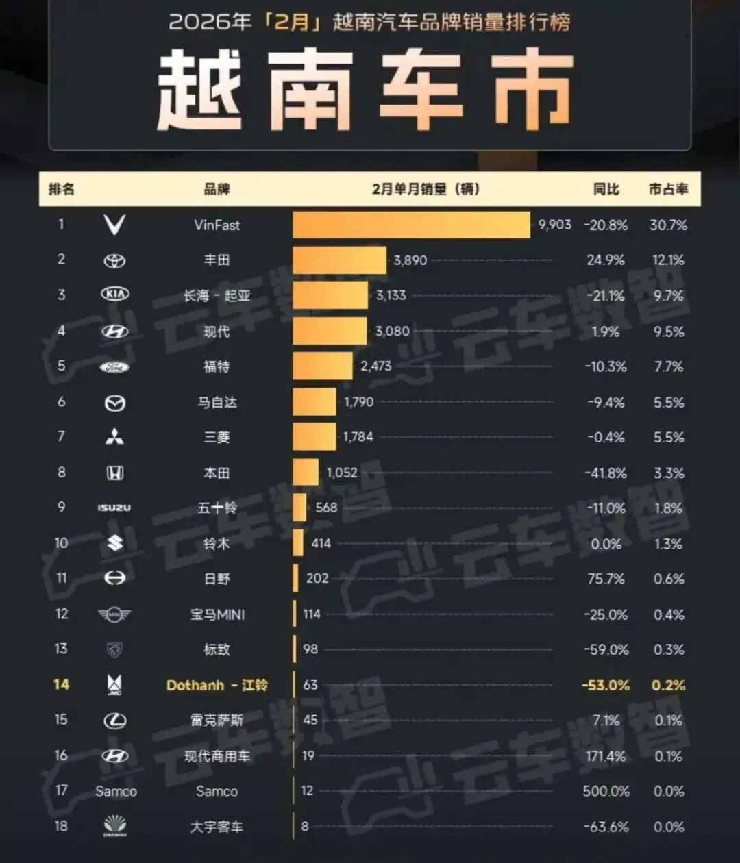 越南最新2月汽车销量排行榜:本土品牌vinfast独占鳌头,销量几乎破万,独占三分之一的市场,几乎垄断当地市场。第二名则是日系丰田,销量暴涨24.9%,可见丰田在越南市场的势头依旧很大。同时,日系丰田还是越南高层的公务车,几乎垄断整个越南高级公务车市场。