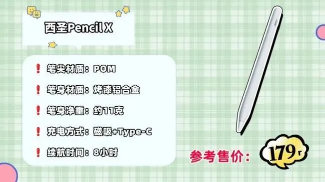 续航和便携性方面,西圣Pencil X采用“无线磁吸充电+Type-C快充”双模式,而且充满电可连续使用约8小时,并支持边用边充,35分钟即可充满,大幅缓解电量焦虑。另外它的笔身使用烤漆铝合金材质,手感顺滑,很符合人体工学设计,加上单支笔的重量仅约11克,相当于传统铅笔,长时间书写也不会造成手腕疲劳。对于想要在百元价位入手高性价比电容笔的用户来说,西圣Pencil X无疑是一款值得重点考虑的选择。