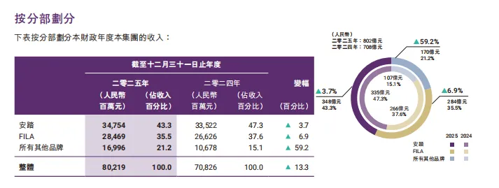 财报详细数据显示,2025年安踏体育整体业务保持高速发展,实现总收入802.19亿元人民币,同比增长13.3%。