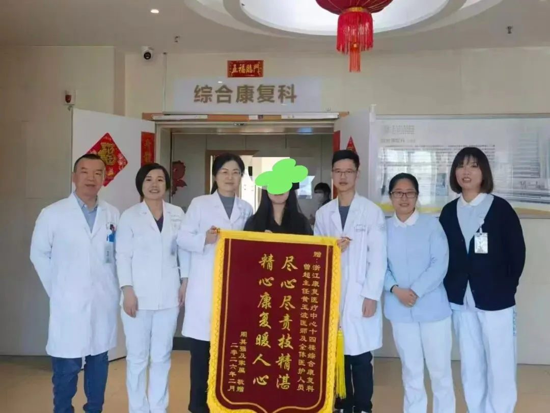 康复后评估:独立行走100米。强哥扶着助行器,一步一步,稳稳走完。走完最后一步,他说:“谢谢。”他的“小棉袄”给我们医护治团队递上锦旗,上面写着八个字:“尽心尽责技精湛 精心康复暖人心”。100米,对普通人来说不足挂齿,但对强哥而言,是他受伤后走过的最远的路。更是医护治团队与家庭合力奔跑的见证。