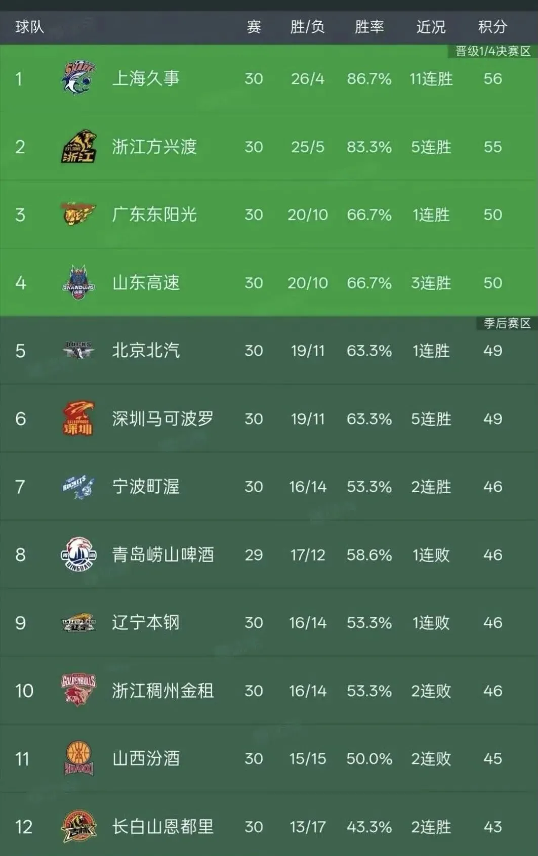不过在第30轮比赛中,由于上海队战胜了山西队、广东队击败了四川队,所以上海队超越了广厦队来到积分榜第一,广东队超越了深圳队重新回到了积分榜第三。山东高速队在上一期积分榜上排名第五,不过在第30轮比赛中,由于收获了一场胜利,因此,他们的排名上升了一位,目前暂列积分榜第四。北京队同样上升了一位,在第30轮积分榜上排名第五。深圳队连降三位,在最新一期的积分榜上排名第六,不过他们的战绩同北京队一样,都是19胜11负。