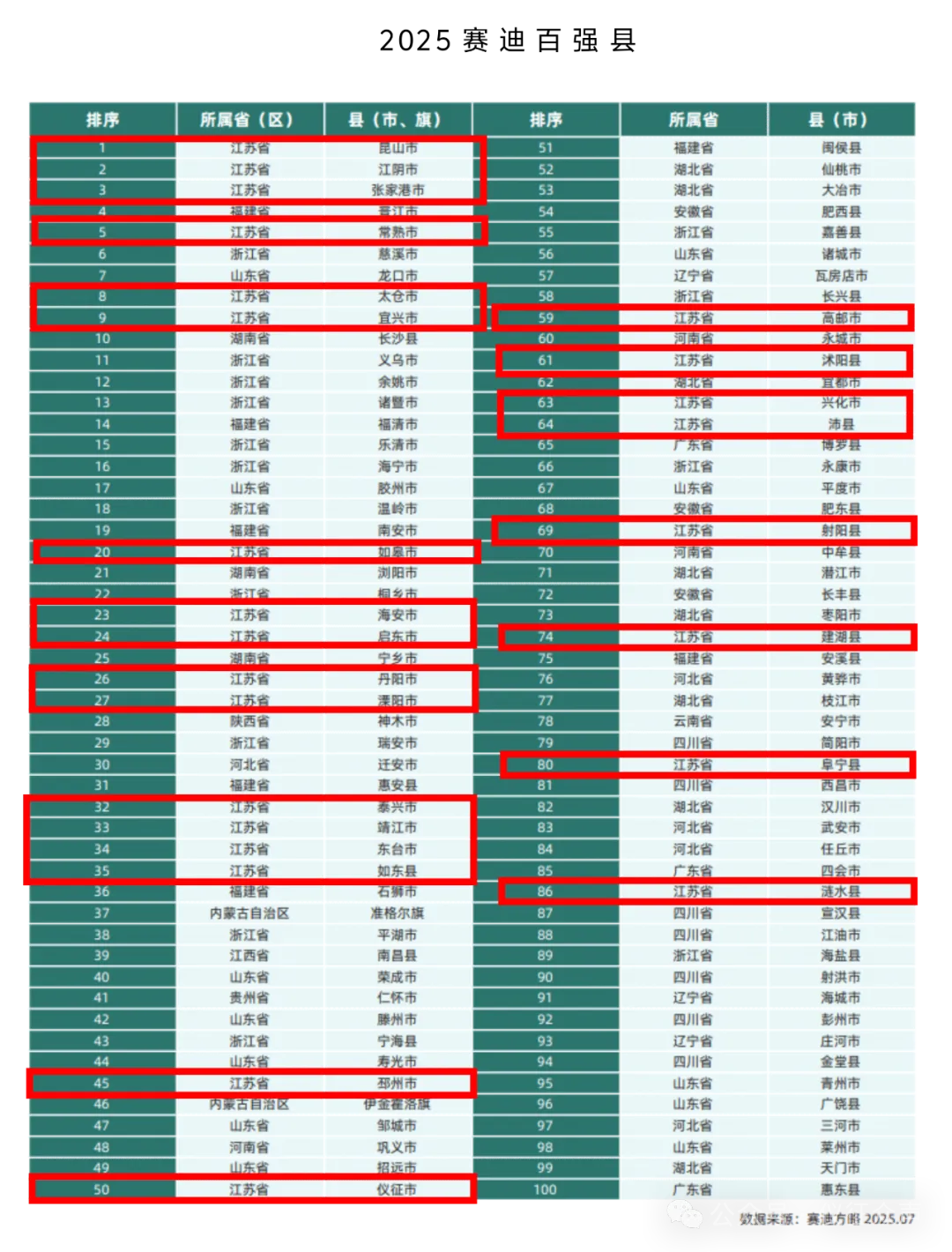 研究指出,2025赛迪县域经济高质量发展百强区域分布不均。百强县东部地区占67席,中部地区占18席,西部地区占12席,东北地区仅占3席,东部地区优势明显。整体呈现出“强县强省”特征,江苏省、浙江省、山东省三省表现突出,分别占25席、15席和12席,百强县前10名中江苏省独占6席,并包揽前3位。