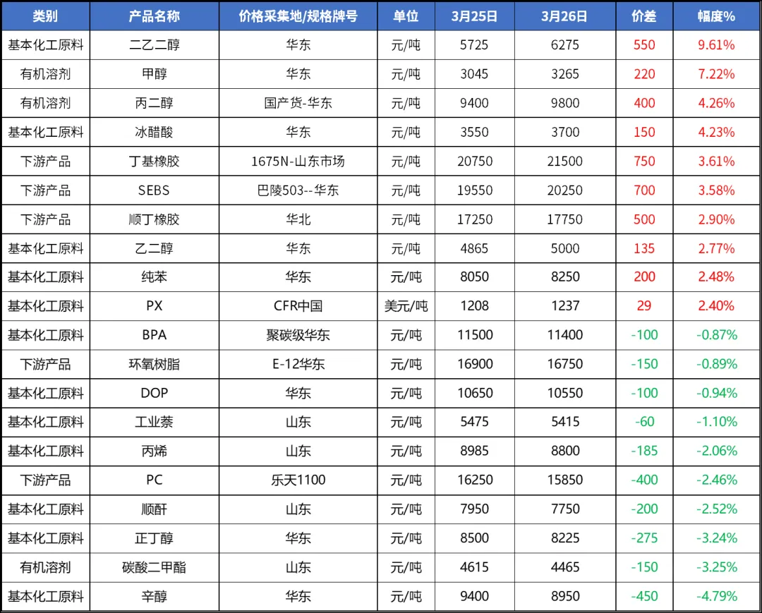 当前位置:首页>排行榜>主要化工产品涨跌排行榜(20260326)